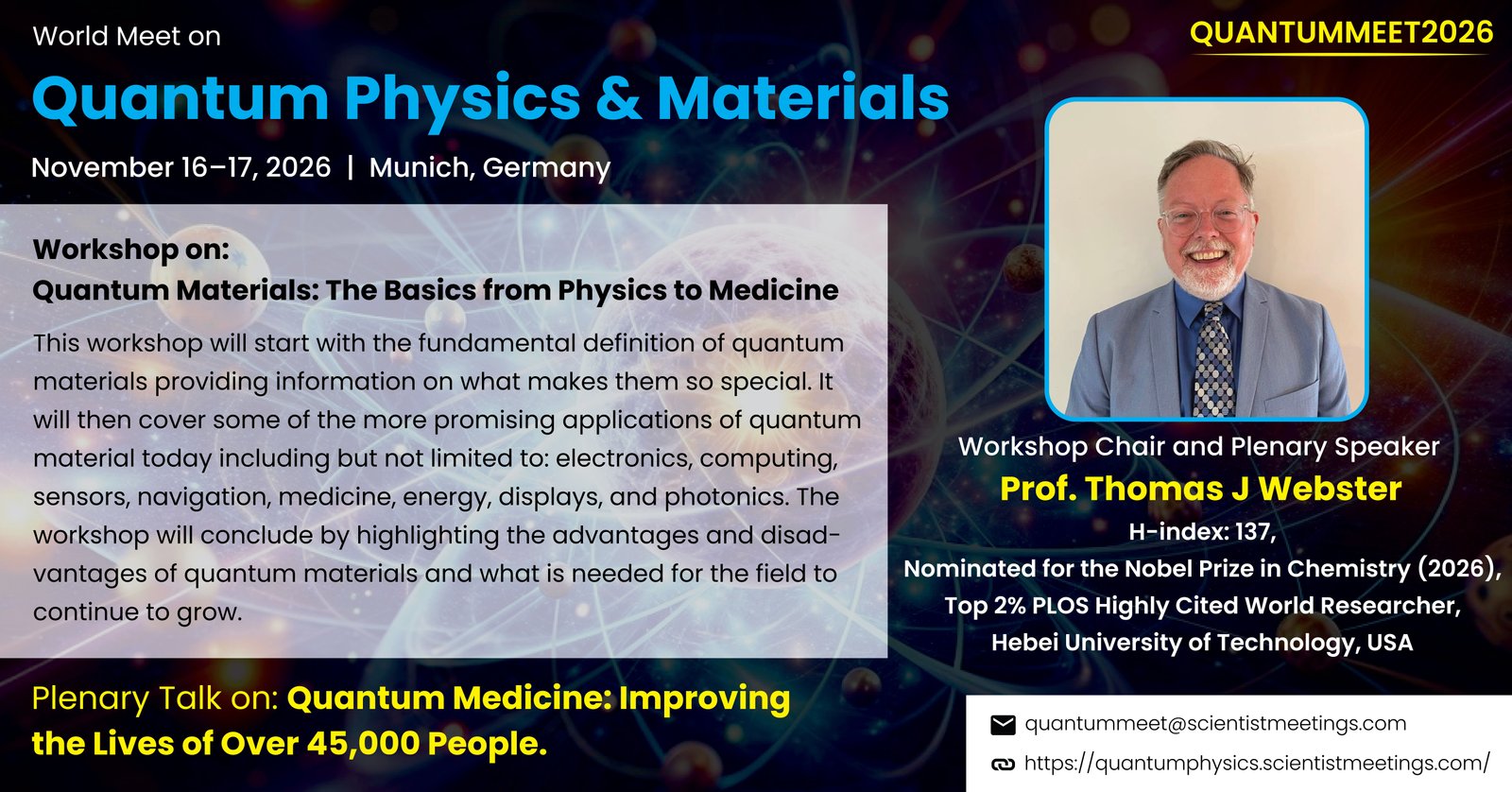 The World Meet on Quantum Physics & Materials (QUANTUMMEET2026) serves as an international platform for researchers, scientists, and industry professionals to share and discuss recent advances in quantum physics, quantum materials, condensed matter physics, nanomaterials, quantum computing, and emerging quantum technologies. The conference promotes interdisciplinary collaboration to accelerate innovation in quantum science and materials research.
